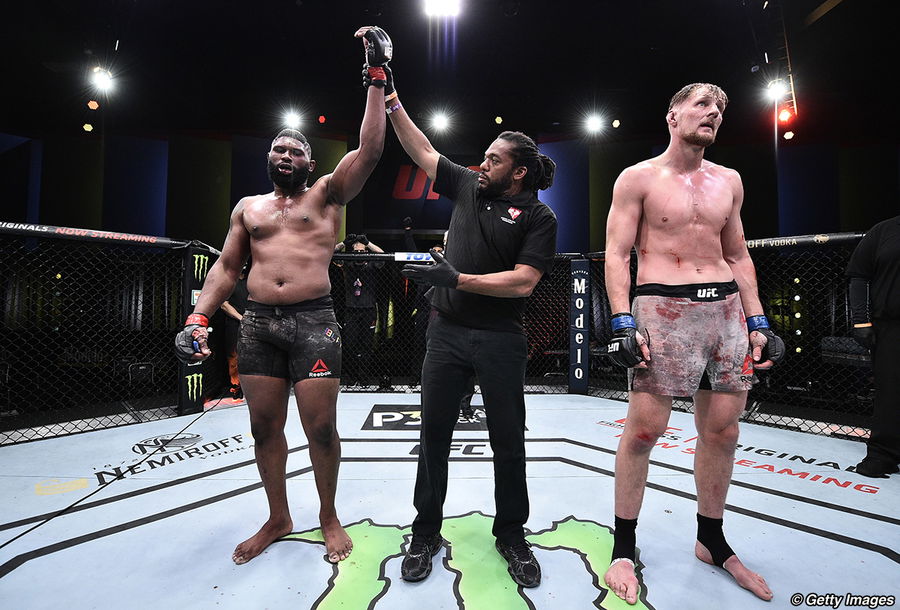 LAS VEGAS, NEVADA – JUNE 20: Curtis Blaydes reacts after his decision victory over Alexander Volkov in their heavyweight bout during the UFC Fight Night event at UFC APEX on June 20, 2020, in Las Vegas, Nevada. (Photo by Chris Unger/Zuffa LLC)