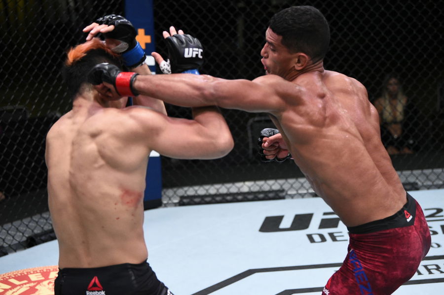 LAS VEGAS, NEVADA – NOVEMBER 28: (R-L) Miguel Baeza punches Takashi Soto of Japan in their welterweight bout during the UFC Fight Night at UFC APEX on November 28, 2020 in Las Vegas, Nevada. (Photo by Chris Unger/Zuffa LLC)