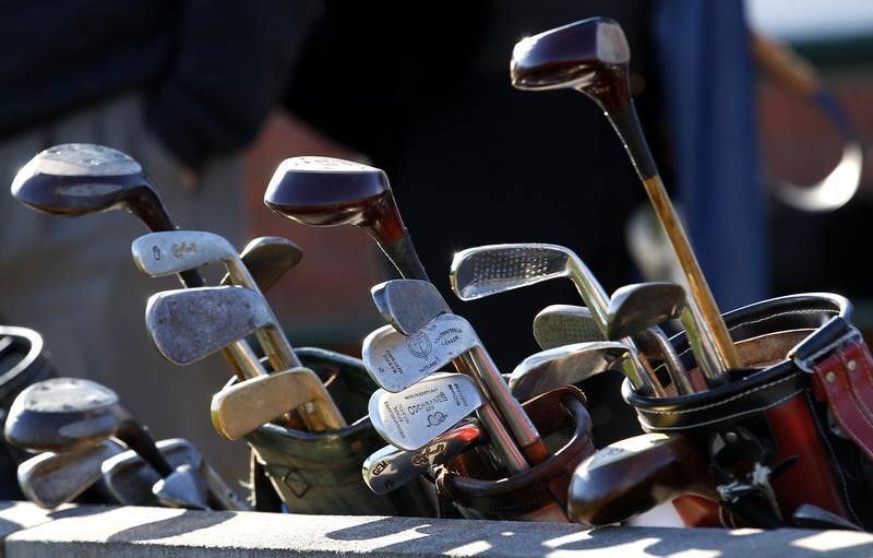 Sets of hickory golf clubs sit outside a clubhouse during the World Hickory Open Golf Championship at Monifeith Links golf course in Monifeith, north east Scotland October 8, 2012. REUTERS/David Moir/Files