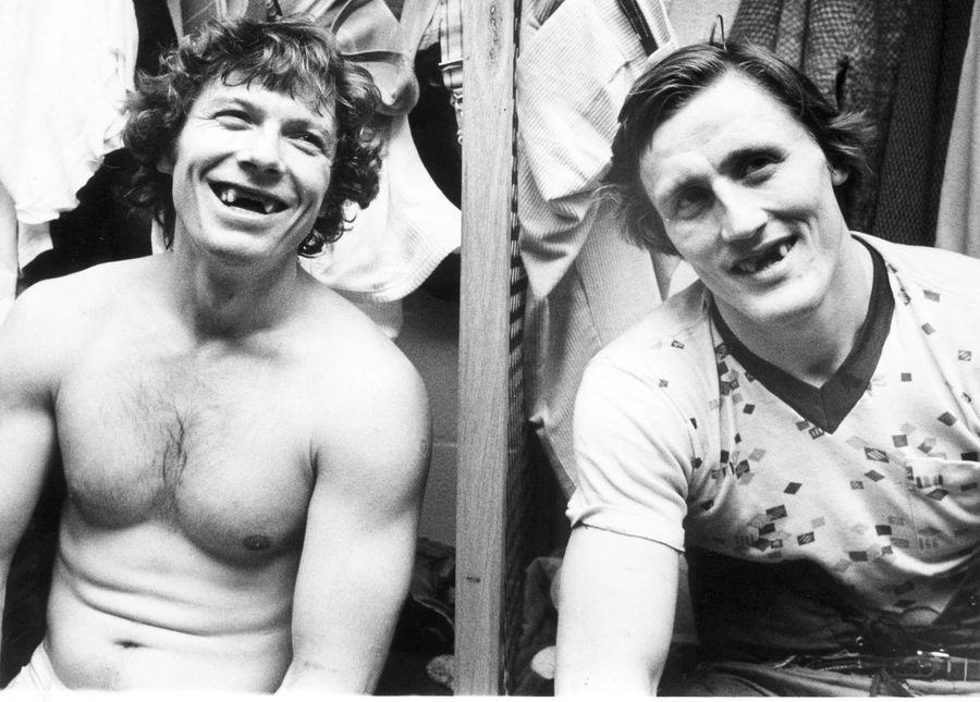 19790206. VADA MJÖLKTÄNDER NHL, Eishockey Herren, USA s lagkapten Bobby Clarke, tv, och Börje Salming garvar ordentligt när Expressens fotograf Hasse Persson undrar vart garnityret tagit vägen. Ny och större protes pa gang skrattar grabbarna. Ishockey x417x *** 19790206 VADA MILK TENDERS NHLs team captain Bobby Clarke, tv, and Börje Salming yawn properly when Expressens photographer Hasse Persson wonders where the garnish has gone New and bigger prosthesis on the way the guys laugh Ice hockey x417x PUBLICATIONxNOTxINxDENxNORxSWExFIN Copyright: xHassexPerssonx