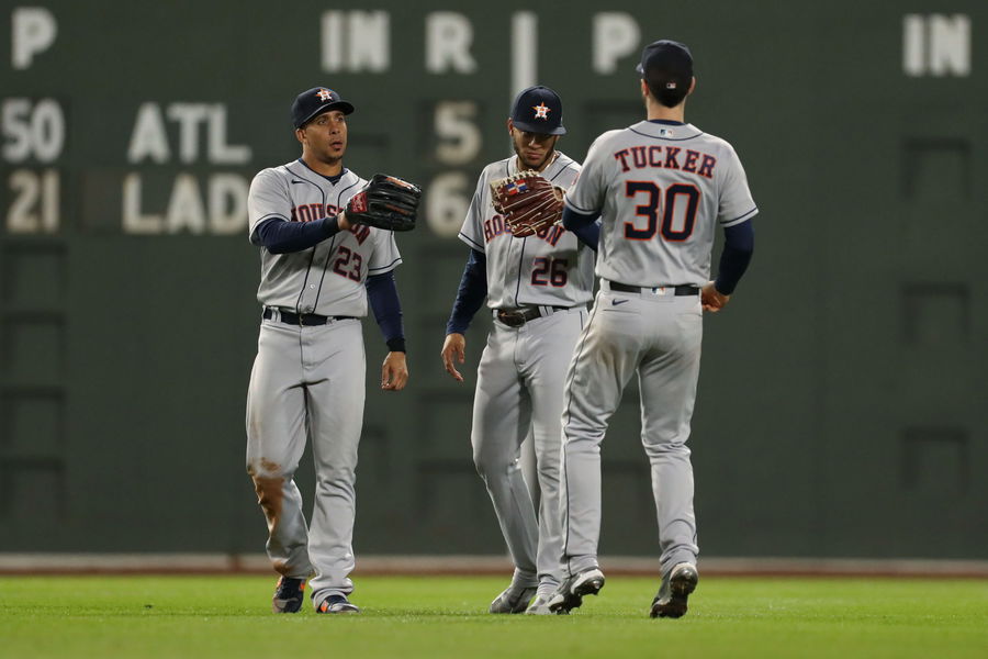 Oct 19, 2021; Boston, Massachusetts, USA; Houston Astros center fielder Jose Siri (26), left fielder Michael Brantley (23), and right fielder Kyle Tucker (30) celebrates after defeating the Boston Red Sox in game four of the 2021 ALCS at Fenway Park. Mandatory Credit: Paul Rutherford-USA TODAY Sports