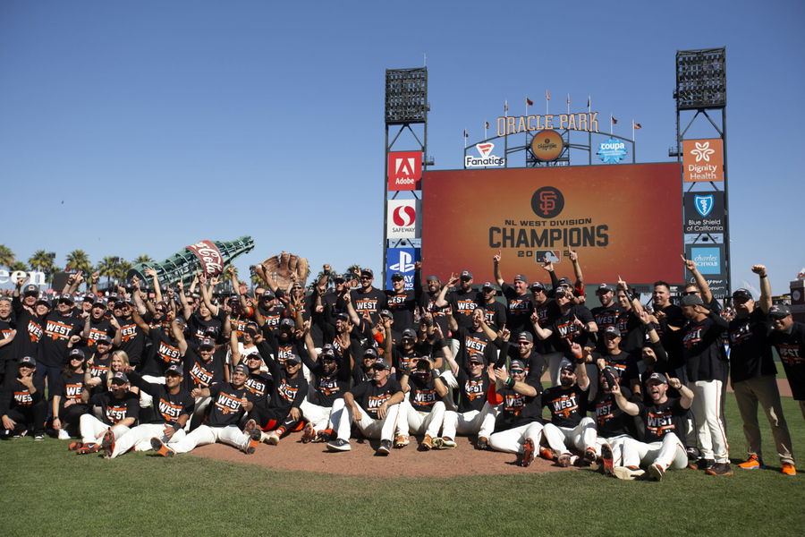 Oct 3, 2021; San Francisco, California, USA; San Francisco Giants players and coaches pose for a group photo as they celebrate their 11-4 victory over the San Diego Padres at Oracle Park. The Giants clinched the National League West Division with the win. Mandatory Credit: D. Ross Cameron-USA TODAY Sports