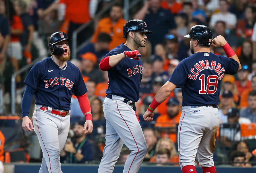 Oct 16, 2021; Houston, Texas, USA; Boston Red Sox designated hitter J.D. Martinez (28) is congratulated by first baseman Kyle Schwarber (18) and left fielder Alex Verdugo (99) after hitting a grand slam against the Houston Astros during the first inning in game two of the 2021 ALCS at Minute Maid Park. Mandatory Credit: Thomas Shea-USA TODAY Sports