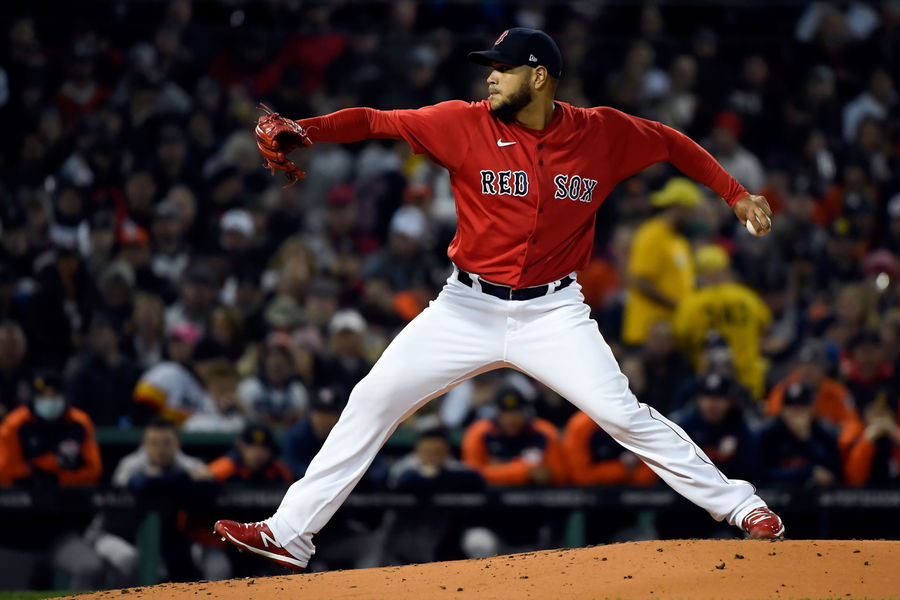 Oct 18, 2021; Boston, Massachusetts, USA; Boston Red Sox starting pitcher Eduardo Rodriguez (57) pitches against the Houston Astros during the second inning of game three of the 2021 ALCS at Fenway Park. Mandatory Credit: Bob DeChiara-USA TODAY Sports