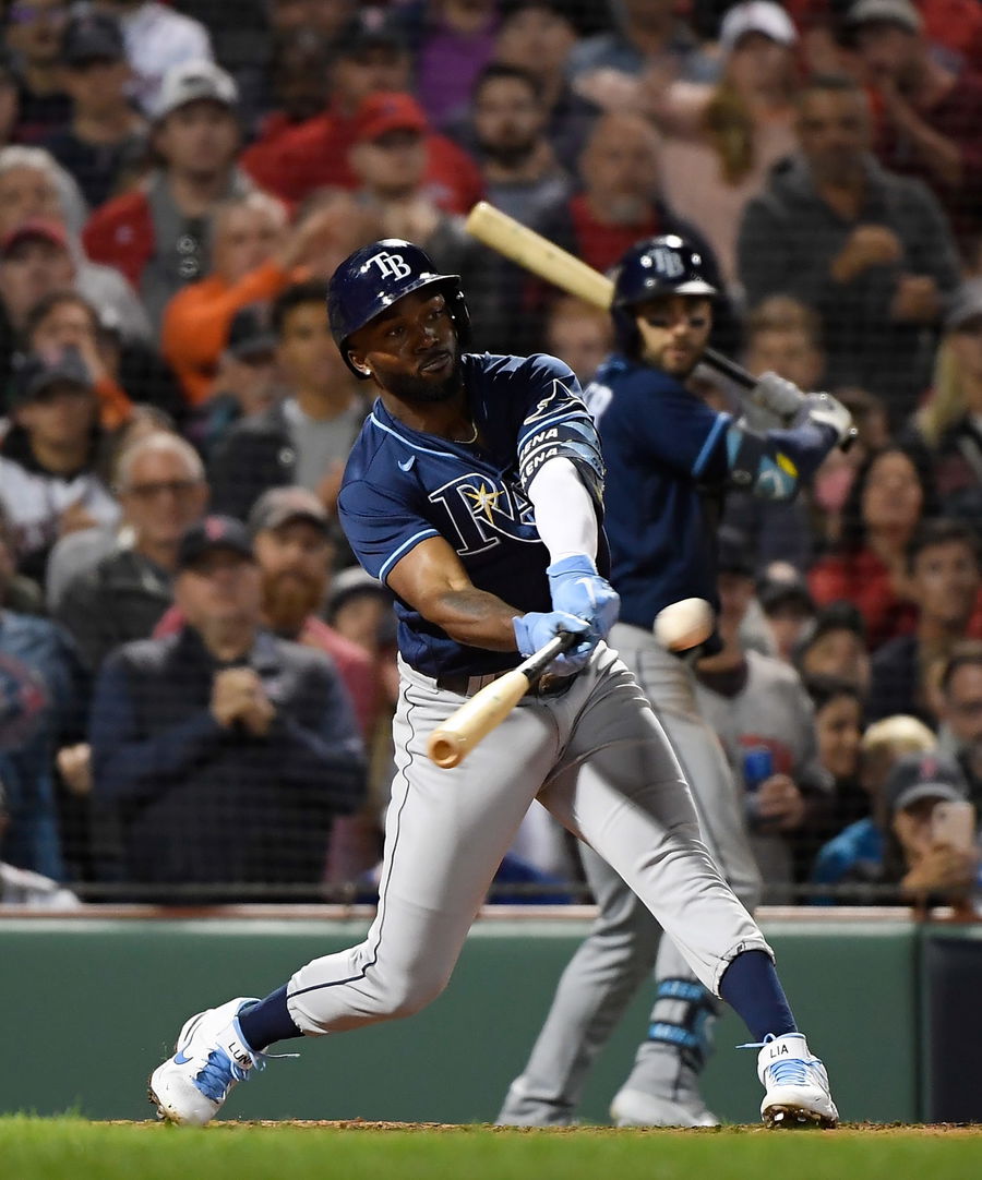 Oct 10, 2021; Boston, Massachusetts, USA; Tampa Bay Rays right fielder Randy Arozarena (56) hits a game tying one run double against the Boston Red Sox during the eighth inning in game three of the 2021 ALDS at Fenway Park. Mandatory Credit: Bob DeChiara-USA TODAY Sports