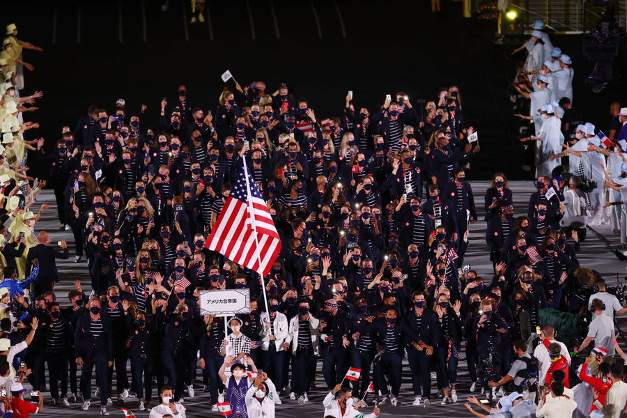 Tokyo 2020 Olympics – The Tokyo 2020 Olympics Opening Ceremony – Olympic Stadium, Tokyo, Japan – July 23, 2021. Flag bearers Sue Bird of the United States and Eddy Alvarez of the United States. They lead their contingent during the athletes parade at the opening ceremony REUTERS/Mike Blake