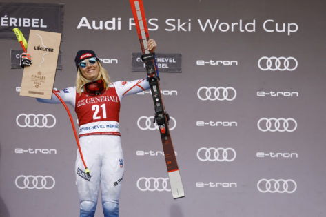 Alpine Skiing – FIS Alpine Ski World Cup – Women’s Downhill – Courchevel, France – March 16, 2022 Mikaela Shiffrin of the U.S. celebrates on the podium with trophy after winning the women’s downhill REUTERS/Christian Hartmann