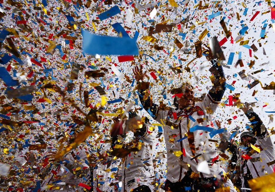 Nov 5, 2021; Atlanta, GA, USA; Atlanta Braves right fielder Joc Pederson (22) celebrates during the World Series championship parade. Mandatory Credit: John David Mercer-USA TODAY Sports