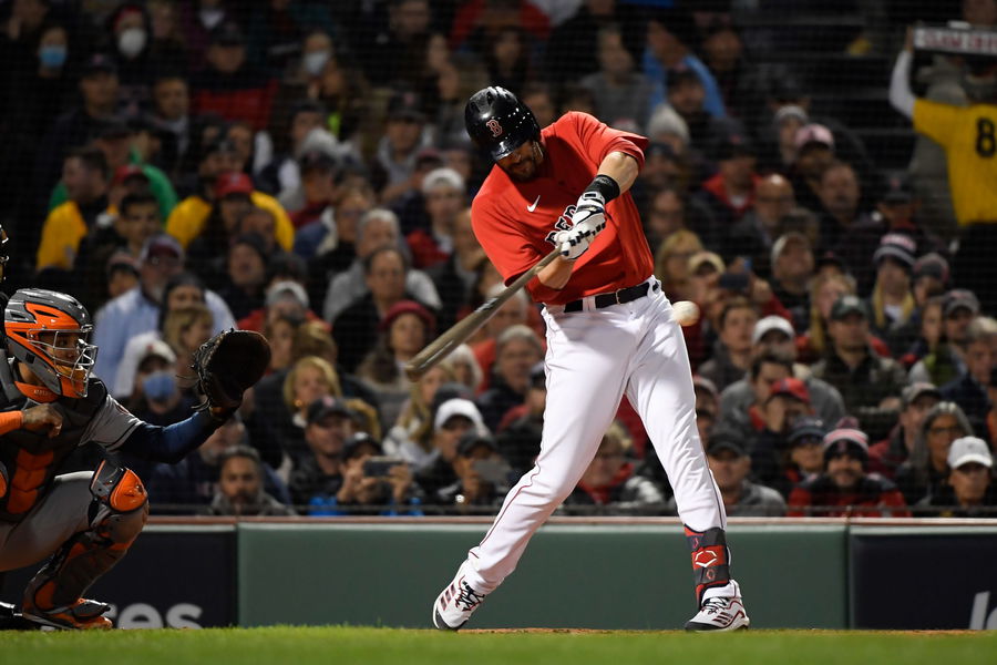 Oct 18, 2021; Boston, Massachusetts, USA; Boston Red Sox designated hitter J.D. Martinez (28) hits a double against the Houston Astros during the second inning of game three of the 2021 ALCS at Fenway Park. Mandatory Credit: Bob DeChiara-USA TODAY Sports