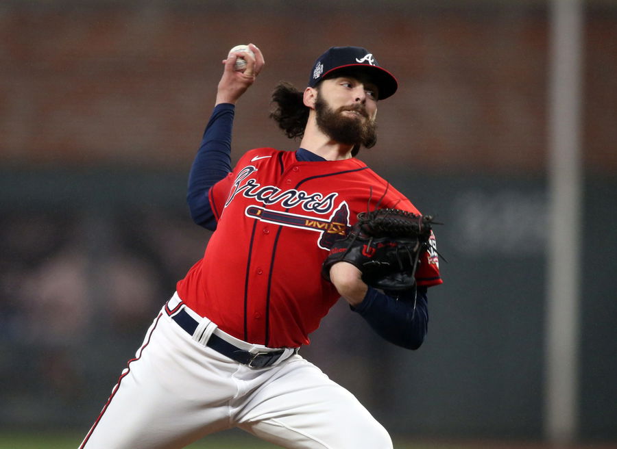Oct 29, 2021; Atlanta, Georgia, USA; Atlanta Braves starting pitcher Ian Anderson (36) throws against the Houston Astros during game three of the 2021 World Series at Truist Park. Mandatory Credit: Brett Davis-USA TODAY Sports