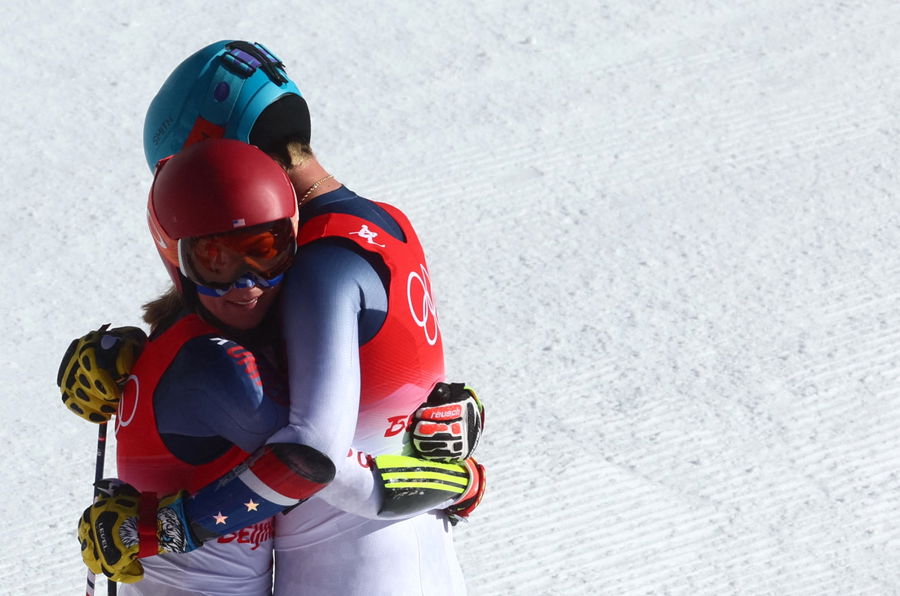 2022 Beijing Olympics – Alpine Skiing – Mixed Team Parallel Small Final – National Alpine Skiing Centre, Yanqing district, Beijing, China- February 20, 2022. Mikaela Shiffrin of the United States and her teammate River Radamus of the United States hug after losing the Small Final. REUTERS/Denis Balibouse