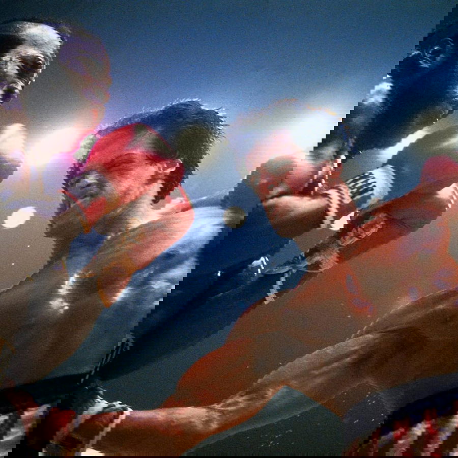 Sylvester Stallone after winning in a scene from the film ‘Rocky IV’, 1985. (Photo by United Artists/Getty Images)