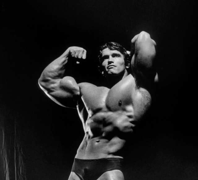 circa 1966: Austrian-born bodybuilder Arnold Schwarzenegger points one hand out as he flexes his torso on Muscle Beach, Santa Monica, California. (Photo by Hulton Archive/Getty Images)