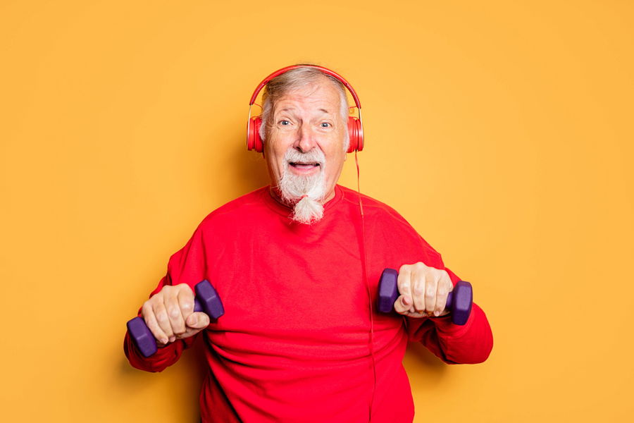 Happy bearded male hipster in red sweatshirt looking at camera and listening to music with headphones while lifting dumbbells against yellow background, Model released HodeiUnzueta_ID12584_382488_009 Copyright: xHodeixUnzuetax