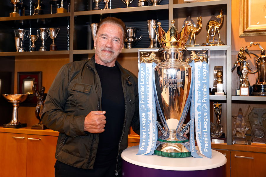 LOS ANGELES, CALIFORNIA – OCTOBER 22: Arnold Schwarzenegger poses with the Premier League Trophy in Santa Monica, ahead of the Premier League Mornings Live fan festival taking place at the LA Memorial Coliseum on Saturday 23 and Sunday 24 October on October 22, 2021 in Los Angeles, California. (Photo by Michael Owens/Getty Images for Premier League)