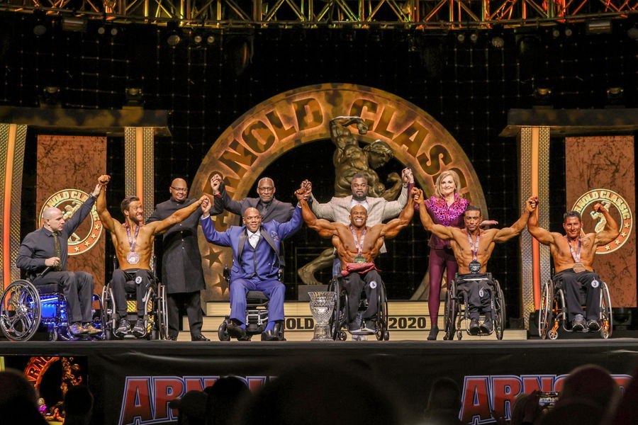 COLUMBUS, OH – MARCH 07: Nick Scott, Bradley Betts, Flex Wheeler, Harold Kelley, Antoni Khadraoui, and Johnny Quinn are joined on stage by presenters as they celebrate following Pro Wheelchair as part of the Arnold Sports Festival on March 7, 2020, at the Greater Columbus Convention Center in Columbus, OH. (Photo by Frank Jansky/Icon Sportswire via Getty Images)