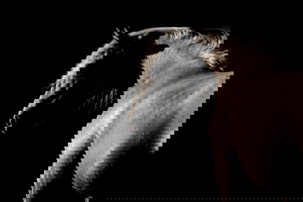A lone wild horse stands in dramatic light. The background is completely black, and the shape and form of her body is illuminated by strong angled lighting to create a chiaroscuro effect.