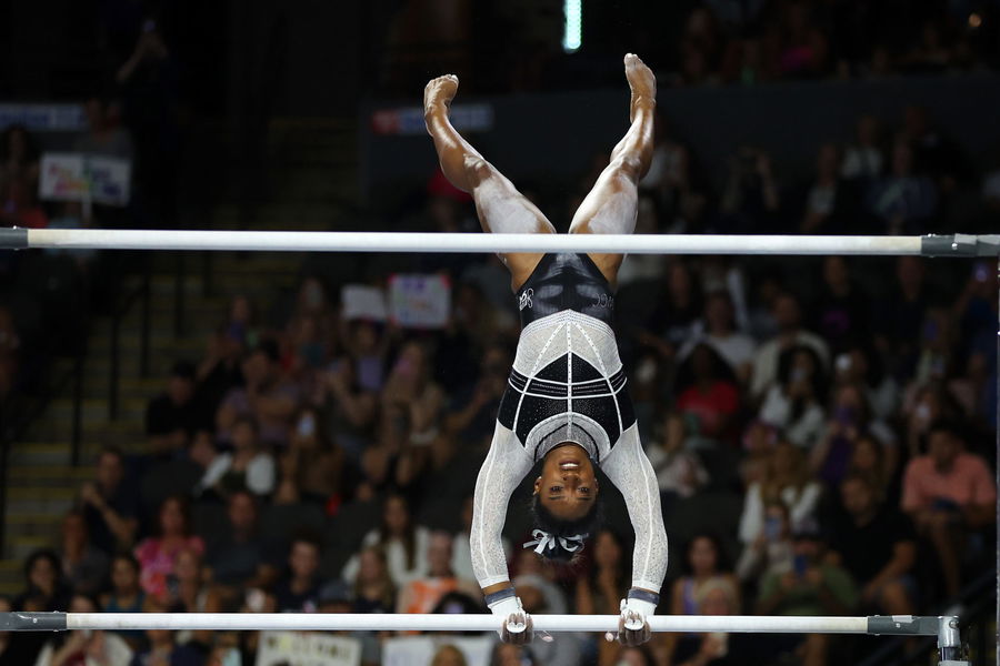 HOFFMAN ESTATES, ILLINOIS – AUGUST 05: Simone Biles competes in the uneven bars during the Core Hydration Classic at Now Arena on August 05, 2023 in Hoffman Estates, Illinois. (Photo by Stacy Revere/Getty Images)