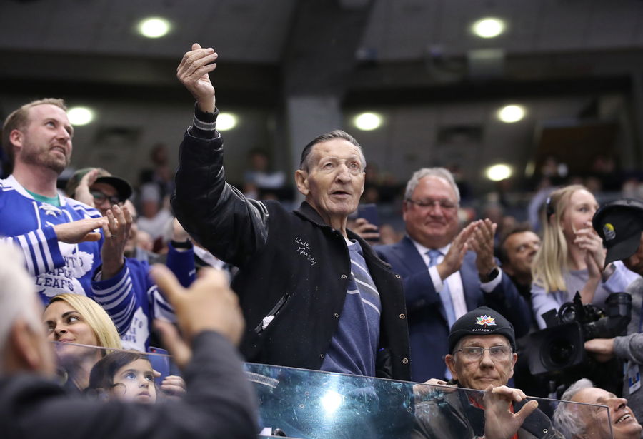 TORONTO, ON – MARCH 11: Walter Gretzky the father of Wayne Gretzky is acknowledged by the crowd as his image is shown on the scoreboard during NHL game action between the Toronto Maple Leafs and the Tampa Bay Lightning on March 11, 2019 at Scotiabank Arena in Toronto, Canada. (Photo by Tom Szczerbowski/Getty Images)