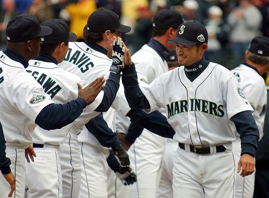 SEATTLE, UNITED STATES: Seattle Mariners Ichiro Suzuki (R) is introduced during pre-game ceremonies before the Mariners game against the Chicago White Sox, in Seattle, 01 April 2002. Ichiro was selected the 2001 American League MVP and Rookie of the Year. AFP PHOTO/Dan LEVINE (Photo credit should read DAN LEVINE/AFP via Getty Images)