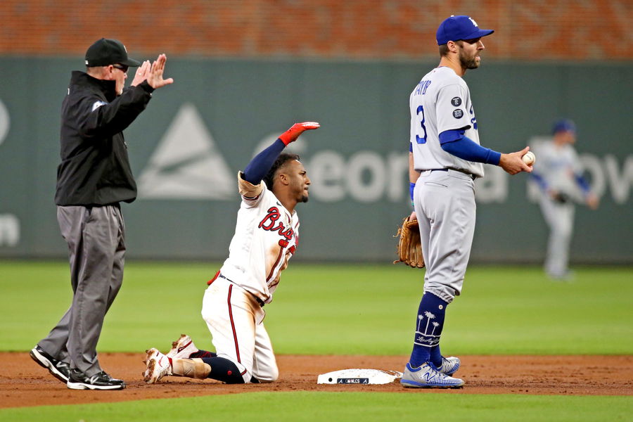 Oct 23, 2021; Cumberland, Georgia, USA; Atlanta Braves second baseman Ozzie Albies (1) slides into second base with a double during the first inning against the Los Angeles Dodgers in game six of the 2021 NLCS at Truist Park. Mandatory Credit: Brett Davis-USA TODAY Sports