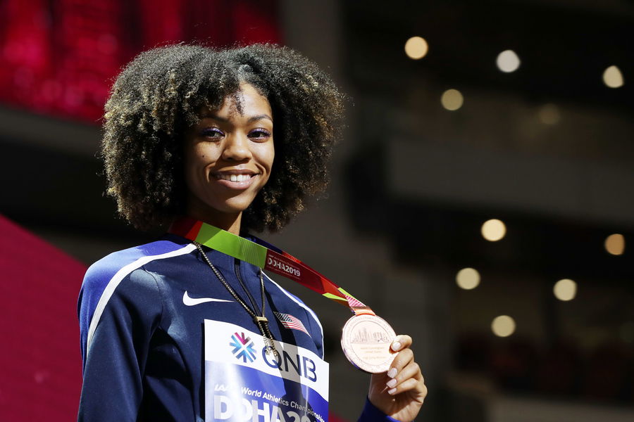 DOHA, QATAR – OCTOBER 01: Vashti Cunningham of the United States, bronze, poses during the medal ceremony for the Women’s High Jump during day five of 17th IAAF World Athletics Championships Doha 2019 at Khalifa International Stadium on October 01, 2019 in Doha, Qatar. (Photo by Maja Hitij/Getty Images)