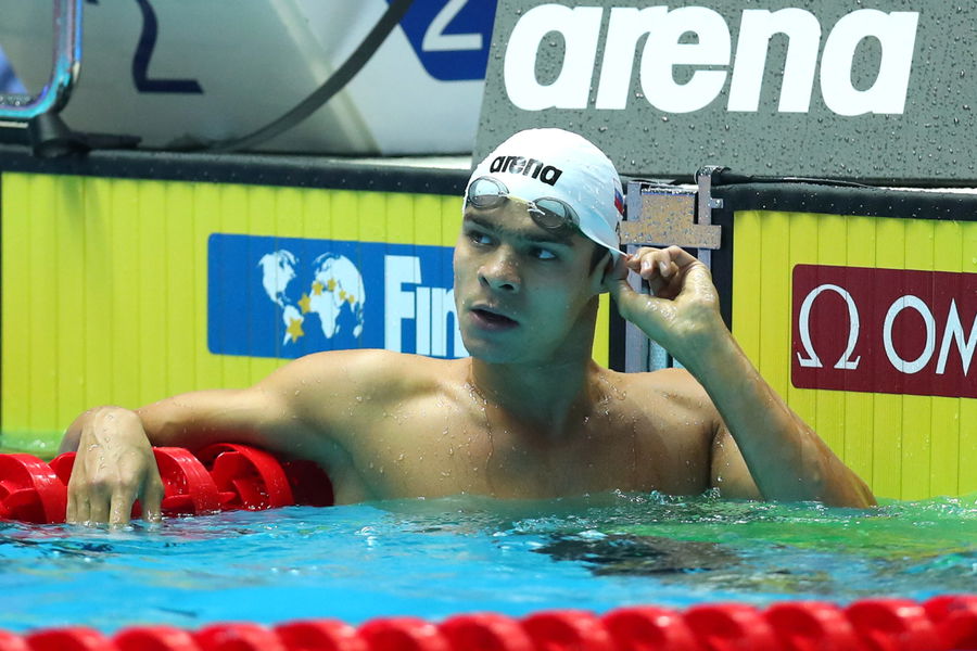 GWANGJU, SOUTH KOREA – JULY 22: Evgeny Rylov of Russia looks at the result board in the Men’s 100m BackstrokeSemifinal on day two of the Gwangju 2019 FINA World Championships at Nambu International Aquatics Centre on July 22, 2019 in Gwangju, South Korea. (Photo by Maddie Meyer/Getty Images)