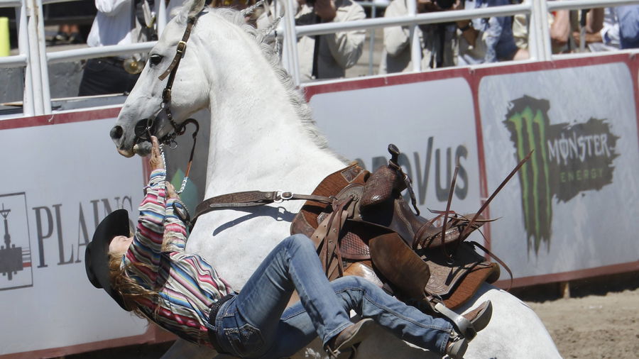 Calgary, Alberta Canada— Cowgirl Lois Ferguson from West, Texas is thrown from her horse during the Ladies Barrel Racing event at the Calgary Stampede rodeo on July 15, 2022. She did not complete her run and was helped off with minor injuries.digital photo by Larry MacDougal