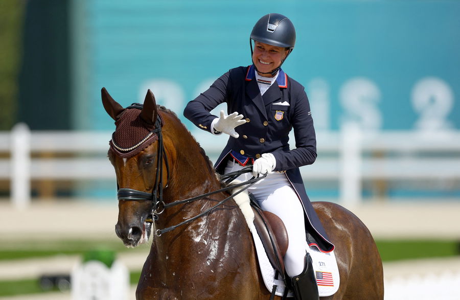Paris 2024 Olympics – Equestrian – Dressage Individual Grand Prix Day 1 – Chateau de Versailles, Versailles, France – July 30, 2024. Adrienne Lyle of United States riding Helix reacts after competing. REUTERS/Matthew Childs