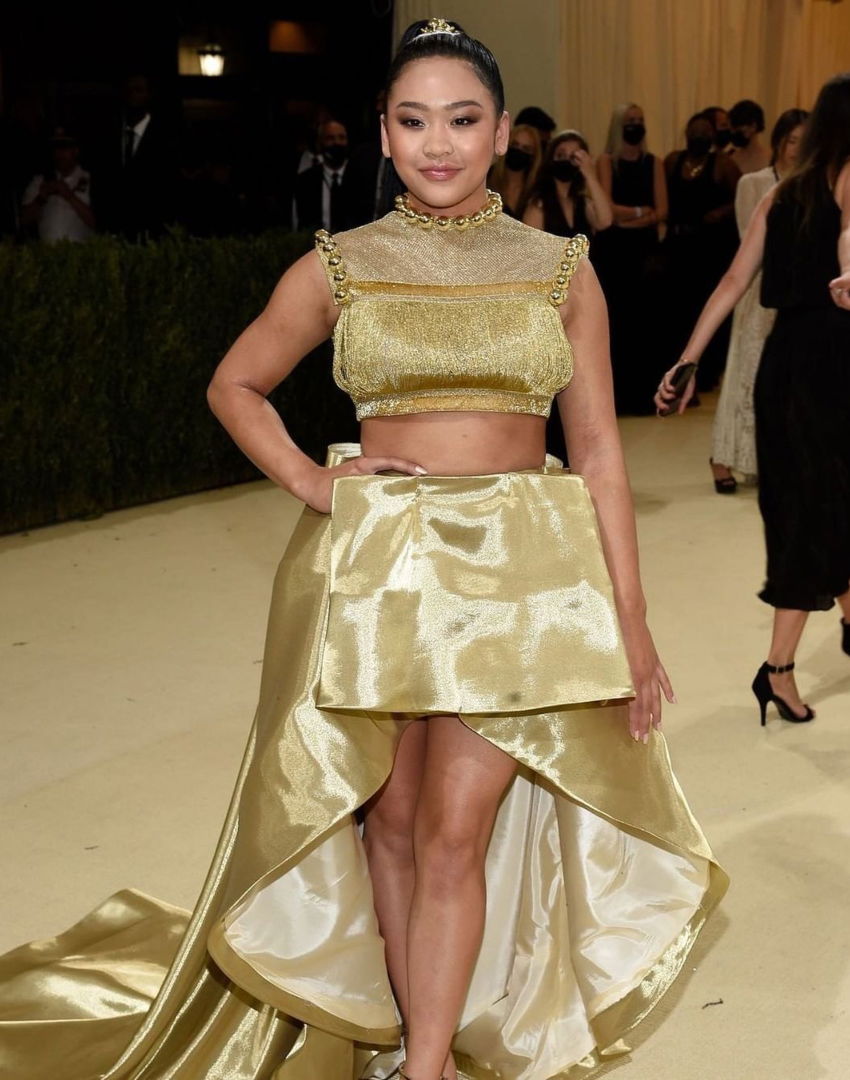 Suni Lee made an impressive entrance into the world of high fashion at her first-ever Met Gala in 2021. The Minnesota native looked stunning in a gold two-piece gown tailored to perfection. It complemented her petite 5’0” frame. Her outfit featured a sleeveless crop, paired with a shiny gold skirt adorned with a slight train. The outfit was by Sukeina.