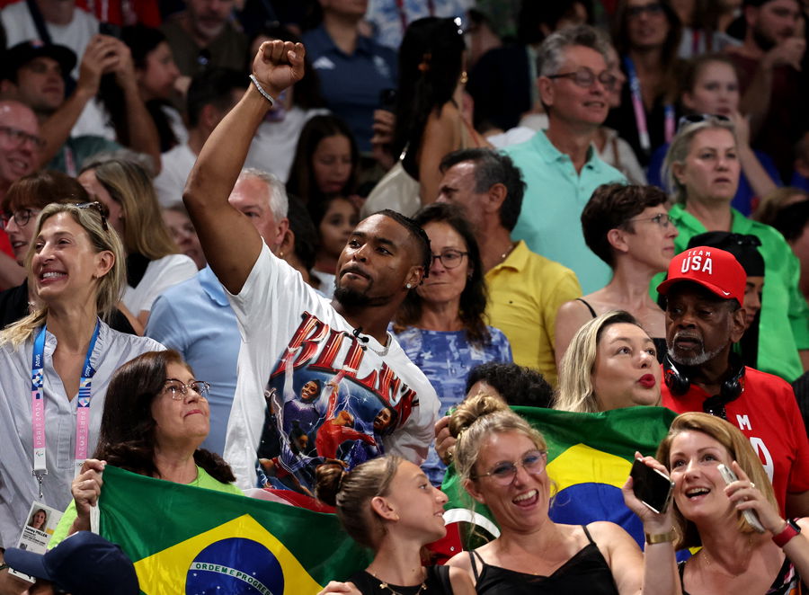 Paris 2024 Olympics – Artistic Gymnastics – Women’s Team Final – Bercy Arena, Paris, France – July 30, 2024. Simone Biles of United States’ husband Jonathan Owens in the stands. REUTERS/Mike Blake