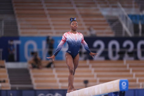 TOKYO, JAPAN – AUGUST 03: Simone Biles of Team United States competes in the Women’s Balance Beam Final on day eleven of the Tokyo 2020 Olympic Games at Ariake Gymnastics Centre on August 03, 2021 in Tokyo, Japan. (Photo by Elsa/Getty Images)