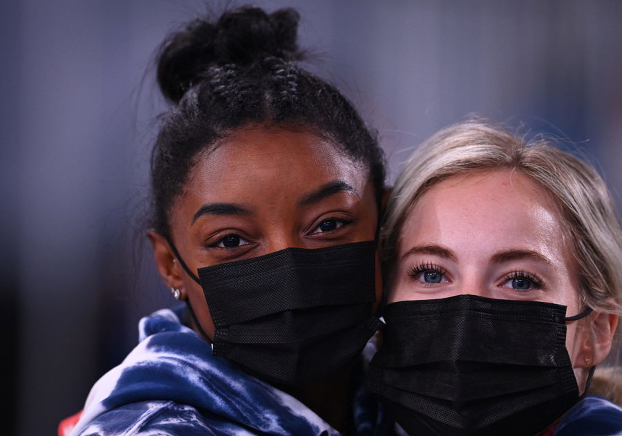 Tokyo 2020 Olympics – Gymnastics – Artistic – Men’s Individual All-Around – Final – Ariake Gymnastics Centre, Tokyo, Japan – July 28, 2021. Simone Biles of the United States and Mykayla Skinner of the United States wearing protective face masks pose REUTERS/Dylan Martinez