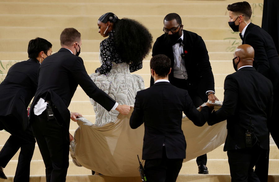 Simone Biles walks up steps at the Met Gala 2021 at the Metropolitan Museum of Art in New York City, New York, U.S. September 13, 2021. REUTERS/Andrew Kelly