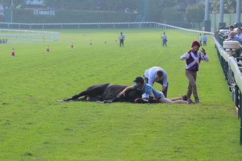 Batch 6, DANEHILL SILENCE, ridden by Olivier Doleuze(right), was death in the barrier trial over 1200Metres (Turf) at Happy Valley. Trainer Richard Gibson(shirt in blue) helped the horse. 15OCT16 (Photo by Kenneth Chan/South China Morning Post via Getty Images)