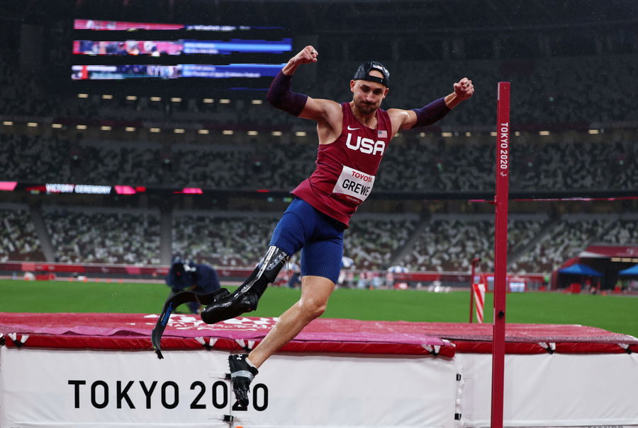 Tokyo 2020 Paralympic Games – Athletics – Men’s High Jump – T63 Final – Olympic Stadium, Tokyo, Japan – August 31, 2021. Sam Grewe of the United States celebrates winning the Gold medal. REUTERS/Athit Perawongmetha