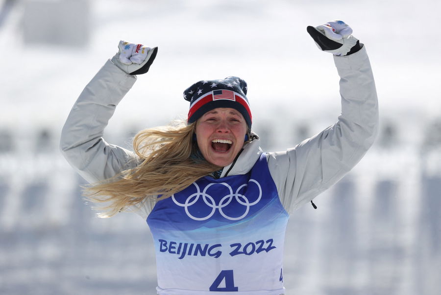 2022 Beijing Olympics – Cross-Country Skiing – Women’s 30km Mass Start Free – National Cross-Country Centre, Zhangjiakou, China – February 20, 2022. Silver medallist Jessie Diggins of the United States celebrates on the podium. REUTERS/Lindsey Wasson