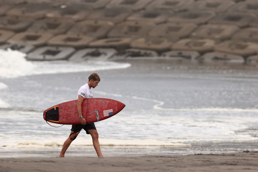 ICHINOMIYA, JAPAN – JULY 25: John John Florence of Team United States walks off the beach after his losing his Men’s Round 1 heat on day two of the Tokyo 2020 Olympic Games at Tsurigasaki Surfing Beach on July 25, 2021 in Ichinomiya, Chiba, Japan. (Photo by Ryan Pierse/Getty Images)