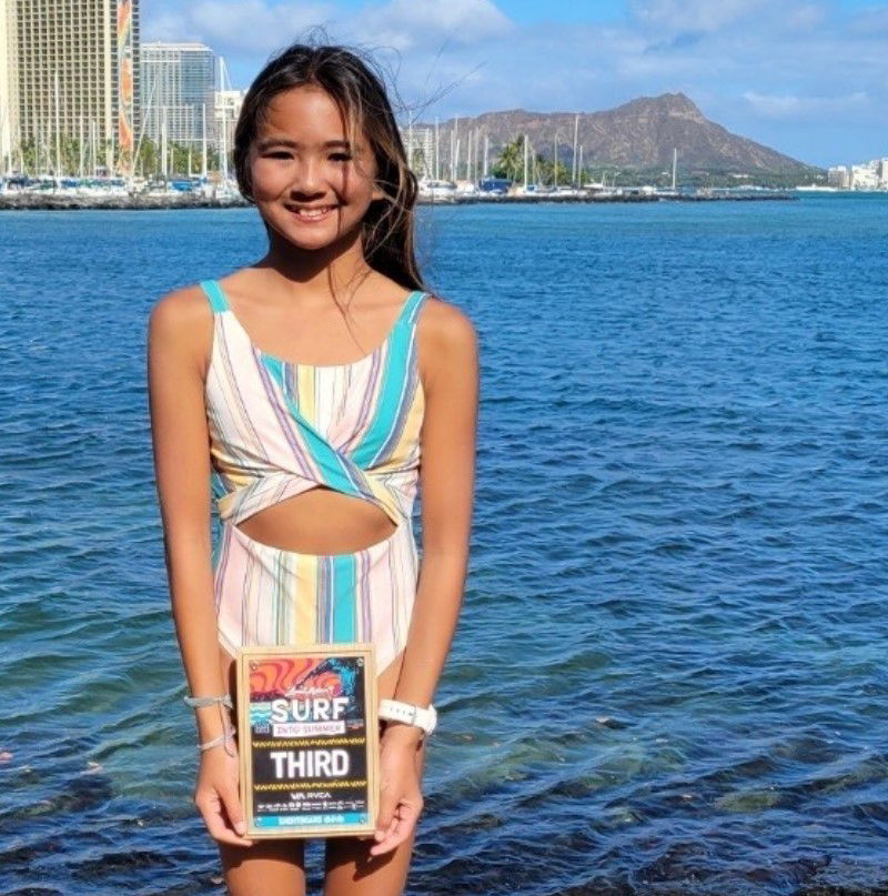 Other participation involvement includes big names like @localmotionhawaii, where Kiki is a team rider and frequently attends brand events. Her progress as a training surfer can be seen as she builds her foundation one wave at a time, or rather, every day. As stated in her Instagram bio, Kiki now collaborates with @tokorosurfboards, a surfboard producer, as a stroked rider. Despite where her accomplishments may have brought her, she still falls just short of the teen age, embodying the adage “Age is just a number.”