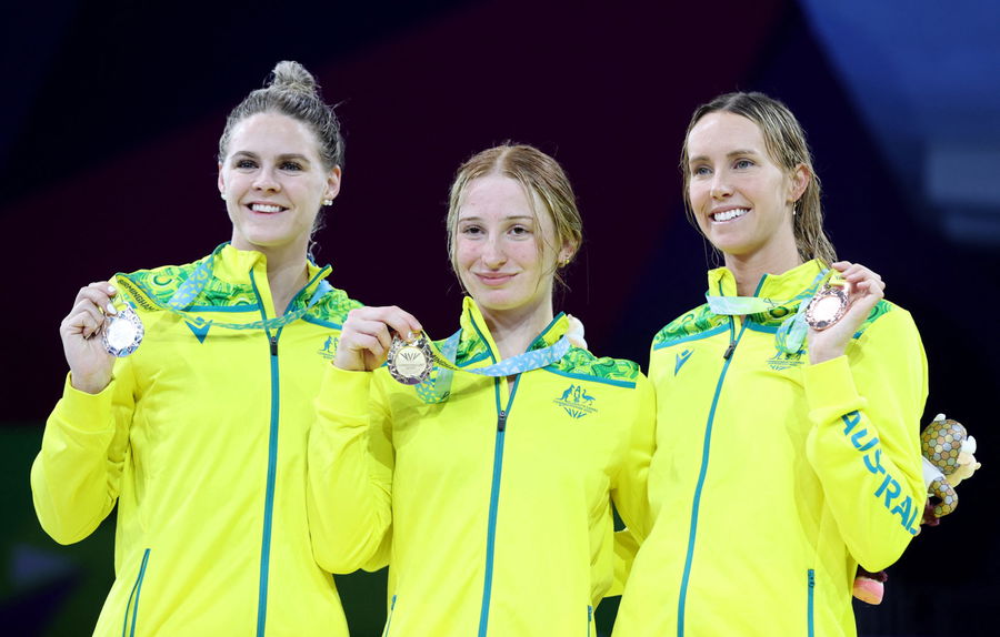 Commonwealth Games – Swimming – Women’s 100m Freestyle – Medal Ceremony – Sandwell Aquatics Centre, Birmingham, Britain – August 2, 2022 Gold Medallist Australia’s Mollie O’Callaghan celebrates on the podium with silver medallist Australia’s Shayna Jack and bronze medallist Australia’s Emma McKeon during the medal ceremony REUTERS/Stoyan Nenov