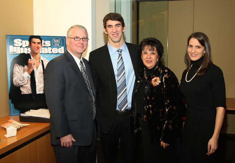 NEW YORK – DECEMBER 02: Phelps’ Swim Coach Bob Bowman, Sportsman of the Year Michael Phelps, Phelps’ mother Debbie Phelps, and Phelps’ sister Hilary Phelps attend the Sports Illustrated 08 Sportsman of the Year Awards at IAC Building on December 2, 2008 in New York City. (Photo by Stephen Lovekin/Getty Images for Sports Illustrated)