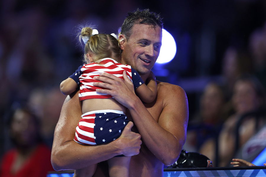 OMAHA, NEBRASKA – JUNE 17: Ryan Lochte of the United States holds daughter Liv Rae Lochte after competing in a semifinal heat for the Men’s 200m individual medley during Day Five of the 2021 U.S. Olympic Team Swimming Trials at CHI Health Center on June 17, 2021 in Omaha, Nebraska. (Photo by Maddie Meyer/Getty Images)