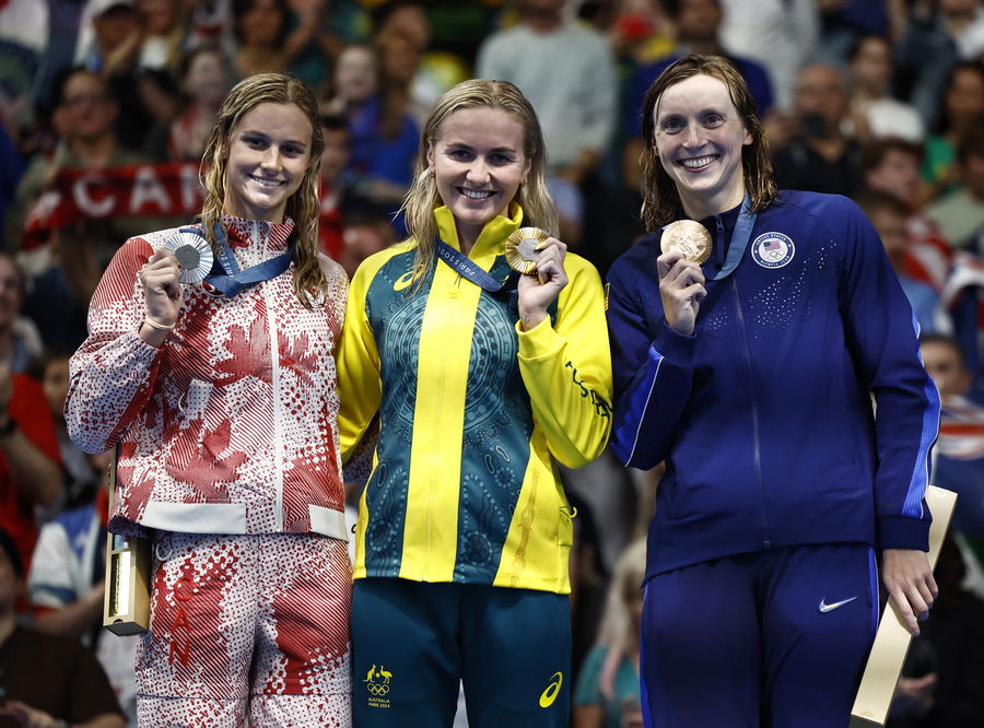 Paris 2024 Olympics – Swimming – Women’s 400m Freestyle Victory Ceremony – Paris La Defense Arena, Nanterre, France – July 27, 2024. Gold medallist Ariarne Titmus of Australia celebrates on the podium after winning the race with silver medallist Summer McIntosh of Canada and bronze medallist Katie Ledecky of United States. REUTERS/Clodagh Kilcoyne
