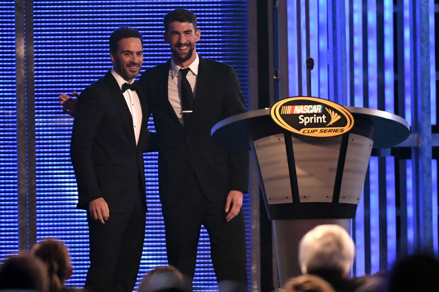 LAS VEGAS, NV – DECEMBER 02: NASCAR Sprint Cup Series Champion Jimmie Johnson (L) is introduced by U.S. Olympic swimmer Michael Phelps during the 2016 NASCAR Sprint Cup Series Awards show at Wynn Las Vegas on December 2, 2016 in Las Vegas, Nevada. (Photo by Ethan Miller/Getty Images)