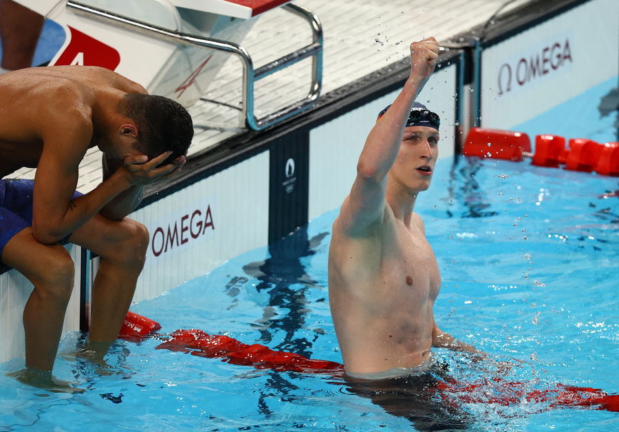 Paris 2024 Olympics – Swimming – Men’s 400m Freestyle Final – Paris La Defense Arena, Nanterre, France – July 27, 2024. Lukas Martens of Germany reacts after winning. REUTERS/Kai Pfaffenbach