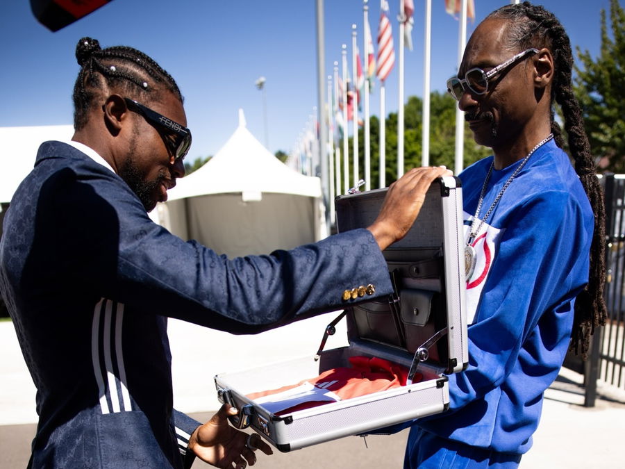The next day, Noah Lyles, who’d been flaunting a mysterious briefcase all season, finally gave fans a peek at what was inside at the US Olympic Trials, with none other than Snoop Dogg by his side. The big reveal? A rare Yu-Gi-Oh trading card, Exodia the Forbidden One, perched on Lyles’ bright red Adidas tracksuit. Snoop and Noah then hit Instagram, sharing the moments with their followers. But that wasn’t all!