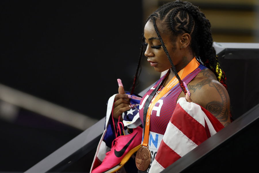 BUDAPEST, HUNGARY – AUGUST 24: Sha’Carri Richardson of Team United States looks on ahead of the Women’s 200m Semi-Final during day six of the World Athletics Championships Budapest 2023 at National Athletics Centre on August 24, 2023 in Budapest, Hungary. (Photo by Patrick Smith/Getty Images)