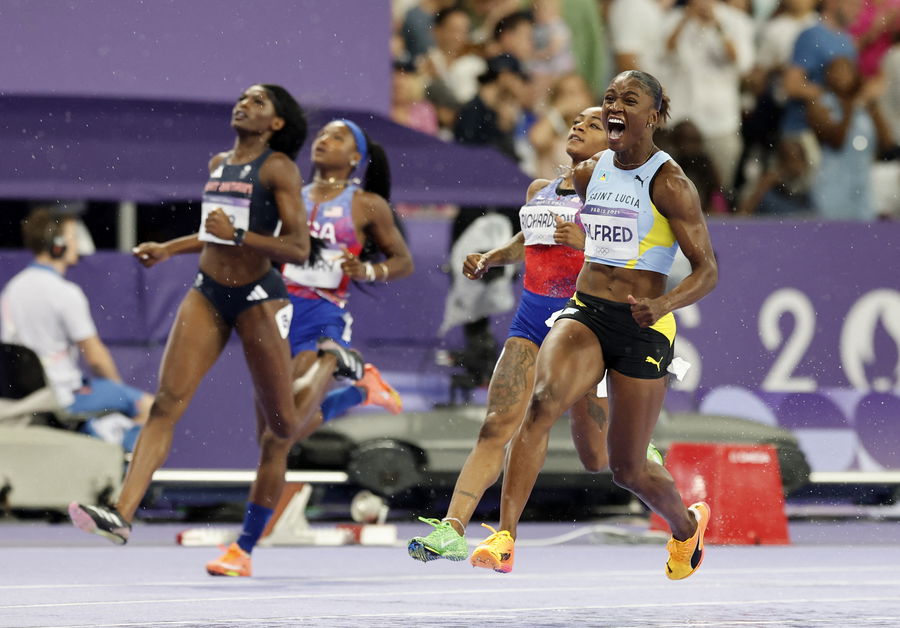 Paris 2024 Olympics – Athletics – Women’s 100m Final – Stade de France, Saint-Denis, France – August 03, 2024. Julien Alfred of Saint Lucia celebrates as she crosses the line to win gold in the final ahead of silver medallist Sha’Carri Richardson of United States REUTERS/Stefan Wermuth