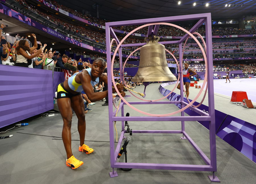 Paris 2024 Olympics – Athletics – Women’s 100m Final – Stade de France, Saint-Denis, France – August 03, 2024. Julien Alfred of Saint Lucia rings the bell as she celebrates after winning gold in the final REUTERS/Kai Pfaffenbach