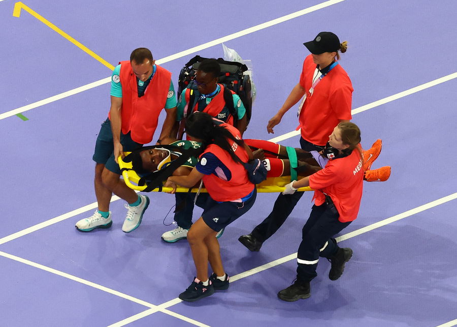 Paris 2024 Olympics – Athletics – Men’s 3000m Steeplechase Final – Stade de France, Saint-Denis, France – August 07, 2024. Lamecha Girma of Ethiopia receives medical attention after sustaining an injury REUTERS/Fabrizio Bensch